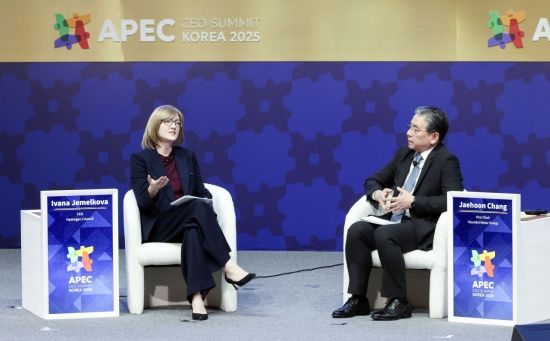 이바나 제멜코바 글로벌 수소위원회 CEO(왼쪽)와 금한승 현대차 부회장이 30일 경북 경주예술의전당에서 열린 아시아태평양경제협력체(APEC) 정상회의 최고경영자(CEO) 서밋(Summit)에서 ‘수소, 모빌리티를 넘어 모두를 위한 차세대 에너지로'를 주제로 토론하고 있다.