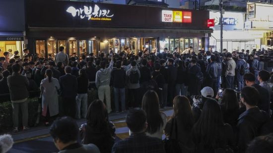 30일 서울 삼성동 인근 깐부치킨에서 젠슨황 엔비디아 최고경영자가 이재용 삼성전자 회장, 정의선 현대차 그룹 회장이 회동할 것으로 알려지자 취재진과 시민들로 붐비고 있다.