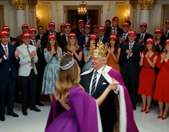 31일 사회관계망서비스(SNS) 엑스(X·옛 트위터) 등에서는 금관을 쓴 트럼프 대통령과 왕관을 쓴 멜라니아 트럼프 여사가 손을 잡고 춤을 추는 합성 영상이 공유되고 있다. 영상을 보면 두 사람은 조명 아래에서 손을 맞잡고 춤을 추고 있다. 트럼프 대통령 내외 주변에는 마가(MAGA·미국을 다시 위대하게)를 상징하는 모자를 쓴 인물들이 손뼉을 치고 있다.