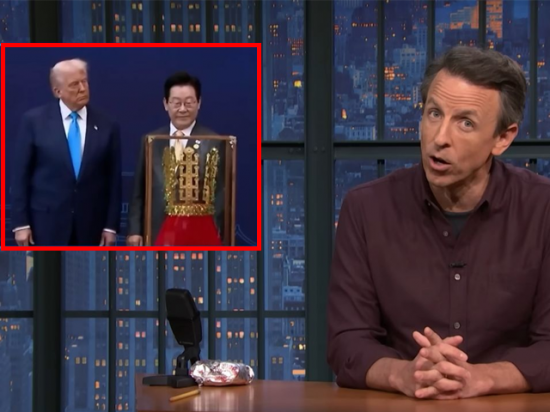 '레이트 나이트' 진행자 마이어스는 "트럼프 대통령은 특별 대우를 좋아하며 아시아에서 즐거운 시간을 보내고 있다"며 "카메라가 사라지자마자 '금관을 써볼 수 있냐'고 묻더라. 오래된 왕관을 쓰면 오래전에 죽은 왕의 분노를 살 위험이 항상 따르지만 말이다"라고 했다. 그는 "그는 왕실 대접을 정말 간절히 원하는데 자국에서도 같은 대접을 받고 싶어한다"며 "그러니 중국의 권위주의 정부를 진심으로 부러워하는 것"이라고 꼬집었다.