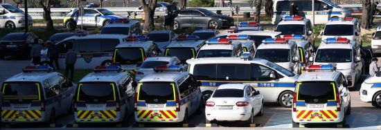 2025 경주 아시아태평양경제협력체(APEC) 정상회의를 앞두고 경찰이 경북도에 '갑호비상'을 발령한 28일 경북 경주시 보문동 한 주차장에 마련된 경찰 현장지휘소에 전국에서 모인 기동 순찰 차량이 집결해 있다. 연합뉴스