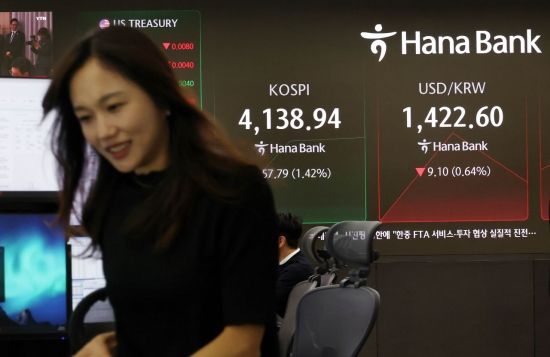 코스피 지수가 연일 사상 최고치를 경신하고 있는 가운데 30일 서울 중구 하나은행 딜링룸 현황판에 코스피, 원/달러 환율 등이 표시돼 있다. 이날 코스피는 전장보다 24.80포인트(0.61%) 오른 4,105.95으로 시작해, 한때 4,146.72로 장중 역대 최고치를 경신했다. 2025.10.30 조용준 기자