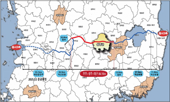 1일 성주군에 따르면 동서3축(새만금~포항) 고속도로는 서부권과 동부권을 직접 연결하는 국가 간선축으로, 2025년 11월 새만금~전주(L=55.1km) 구간이 개통되면, 무주~성주~대구 구간만이 미개통 상태로 남게 되어 현재까지 영호남 간 물류 이동과 산업 연계가 크게 제약을 받아왔다.