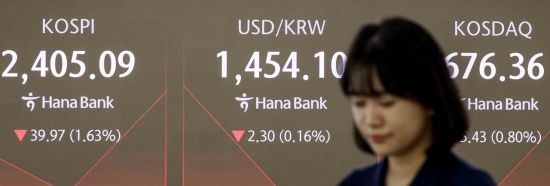 코스피가 전 거래일 대비 44.32포인트(1.81%) 하락한 2400.74에 개장한 11일 서울 중구 하나은행 딜링룸에서 딜러들이 업무를 보고 있다. 서울 외환시장에서 원달러 환율은 전 거래일 대비 2.4원 내린 1454원에 거래를 시작했다. 2025.4.11. 강진형 기자