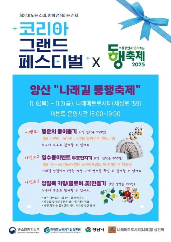 이와 함께 양산사랑카드 5% 추가 할인, 디지털온누리상품권 10∼15% 특별환급, 상생소비복권 응모 등 코리아 그랜드 페스티벌의 소비 혜택을 함께 누릴 수 있어 시민들에게 실질적인 소비 만족도를 높일 것으로 기대된다.