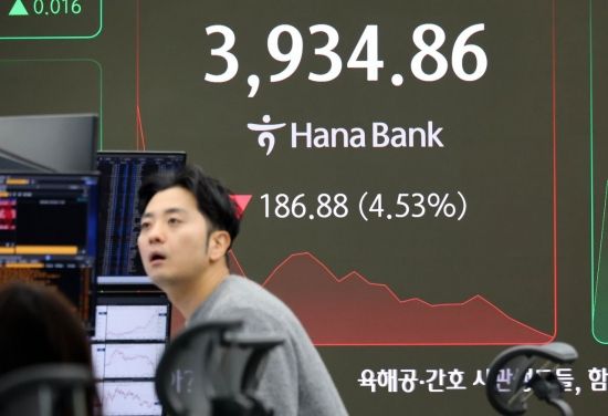 코스피가 미국 기술주 급락에 덩달아 휘청이며 장중 5% 가까이 급락한 5일 서울 중구 하나은행 딜링룸 현황판에 코스피, 코스닥 등이 표시돼 있다. 이날 9시 9분 기준 코스피는 전장보다 123.87포인트(3.01%) 하락한 3,997.87시작하며 4,000선을 돌파한지 7거래일 만에 3,900선도 내줬다.