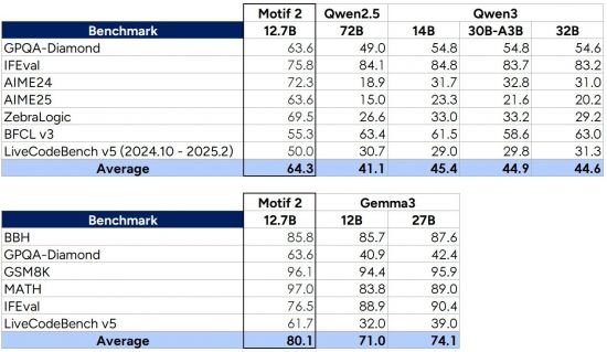 벤치마크 결과 Motif 12.7B 추론 능력을 평가하는 수학, 과학, 논리 과제에서 720억 매개변수를 가진 알리바바 큐원 2.5(72B)을 능가했다. 구글 젬마3 동급 모델과의 비교에서도 주요 추론 능력 관련 평가 지표에서 더 나은 점수를 얻었다.