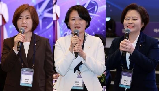 김미애 국민의힘 의원, 박지혜 더불어민주당 의원, 정춘생 조국혁신당 의원(왼쪽부터)이 6일 서울 중구 롯데호텔에서 아시아경제 주최로 열린 '2025 여성리더스포럼'에서 축사를 하고 있다. 김현민 기자