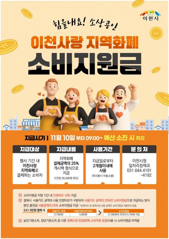 경기도 이천시는 경기침체로 어려움을 겪는 소상공인을 돕고 지역 내 소비를 촉진하기 위해 10일부터 30일까지 '힘을 내요! 소상공인' 이천사랑 지역화폐 소비지원금 행사를 진행한다.