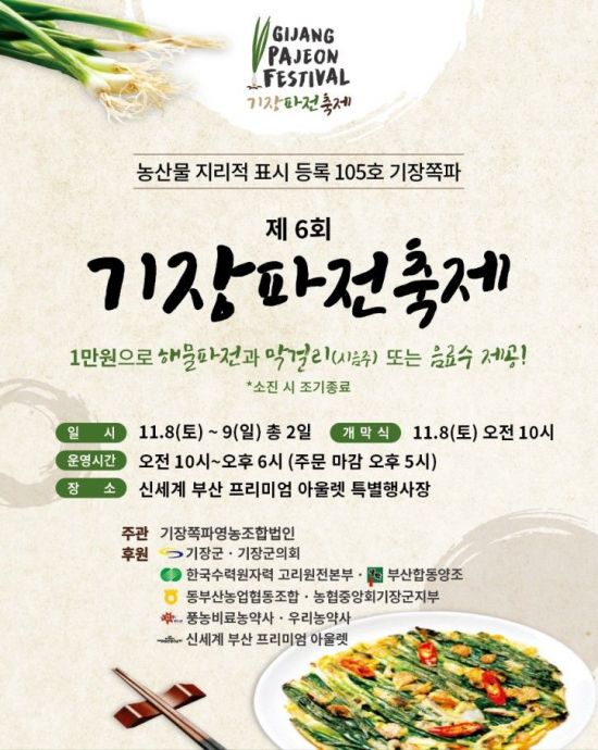 부산 기장군이 오는 8일부터 9일까지 이틀간 신세계 부산 프리미엄 아울렛 주차장 일원에서 '제6회 기장파전축제'를 개최한다.