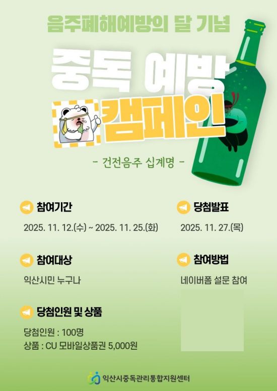 전북 익산시가 익산시중독관리통합지원센터(센터장 이현기)와 함께 오는 12일~25일까지 '음주폐해 예방의 달 캠페인'을 진행한다.