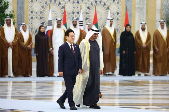 이재명 대통령과 무함마드 빈 자이드 알 나흐얀 대통령은 이날 UAE 대통령궁인 '카스르 알 와탄'에서 한-UAE MOU 교환식을 가졌다.