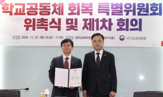 차정인 국가교육위원장(오른쪽)이 27일 서울 종로구 정부서울청사에서 열린 제1차 학교공동체 회복 특별위원회에서 김용 특위위원장에게 위촉장을 수여하고 기념촬영을 하고 있다.