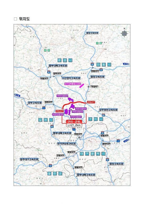 구미~군위 고속도로는 구미에서 군위군 효령면(중앙고속도로)까지 총 21.2㎞ 구간을 4차로로 신설하는 사업으로, 사업비는 약 1조5627억원 규모다. 이는 1970년 경부고속도로 이후 55년 만에 구미를 통과하여 동서를 잇는 첫 고속도로라는 점에서 의미가 크다.