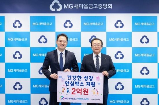 김인 새마을금고 지역희망나눔재단 이사장(오른쪽)과 박충관 국제개발협력 NGO 지파운데이션 대표(왼쪽)가 서울 강남구 새마을금고중앙회에서 열린 안심박스 지원사업 기념식(2025.5.28.)에서 기부금을 전달하고 사진촬영을 하고 있다.