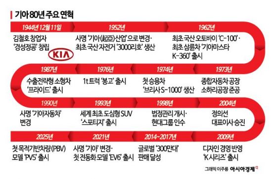 2020년대 들어 전동화라는 대전환의 시기를 맞아 사명을 바꾸는 등 또다시 변화를 시도했다. 그 변화는 지금도 현재진행형이다. 전동화 'EV 시리즈'를 확대하면서 친환경 모빌리티 위주로 사업구조를 재편하고, 목적기반차량(PBV)이라는 새로운 모빌리티를 선보였다. 다목적 차량 봉고의 맥을 잇는 PBV 'PV5'는 출시 이후 해외에서 호평받으며 기아의 80년 도전정신을 증명하고 있다.