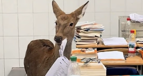 중국 쓰촨성의 한 학교에서 마스코트 사슴이 교실에 들어가 시험지를 먹는 장면이 포착돼 화제다.