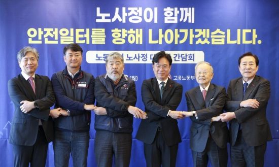 8일 서울 중구 프레스센터에서 열린 '노동안전 노사정 대표자 간담회'에 참석한 노사정 대표자들이 손을 맞잡고 기념촬영 하고 있다. 왼쪽부터 류현철 고용노동부 산업안전보건본부장, 양경수 민주노총 위원장, 김동명 한국노총 위원장, 김영훈 고용노동부 장관, 손경식 한국경영자총협회 회장, 김기문 중소기업중앙회 회장.