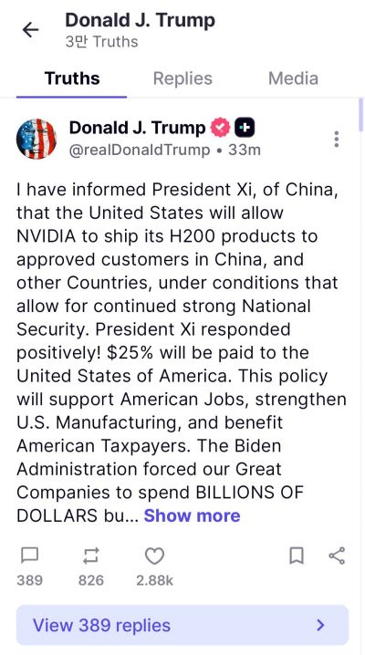 트럼프 대통령은 이날 장 종료 후 자신이 만든 사회관계망서비스(SNS)인 트루스소셜을 통해 "시진핑 중국 국가주석에게 엔비디아가 중국 및 기타 국가의 승인된 고객들에게 'H200' 칩을 판매할 수 있도록 허용할 것이라고 알렸다"고 밝혔다.