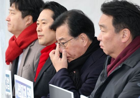 송언석 국민의힘 원내대표가 10일 국회 본청 앞에서 '더불어민주당의 8대 악법' 저지 릴레이 천막농성장에서 안경을 고쳐쓰고 있다. 국민의힘은 이른바 '8대 악법' 저지 시점까지 농성을 이어갈 방침이다. 2025.12.10 김현민 기자
