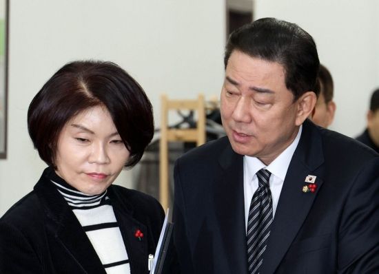김병기 더불어민주당 원내대표와 한정애 정책위의장이 11일 국회에서 열린 정책조정회의에 참석하고 있다.