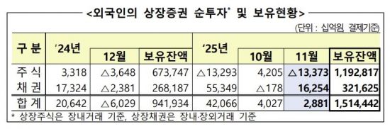 외국인이 11월 국내 증시에서 13조원 넘게 순매도하며 6개월 만에 매도세로 전환했다. 반면 채권 시장에서는 1개월 만에 순투자에 나섰다.