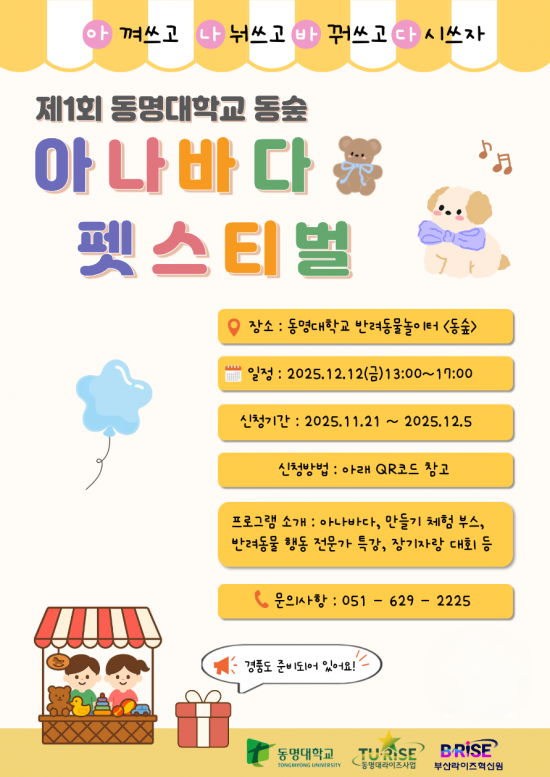 동명대는 12일 교내 반려견 놀이터 '동숲'에서 지역사회와 함께하는 특별한 반려동물 문화행사인 '제1회 동숲 아나바다 펫스티벌'을 개최한다.