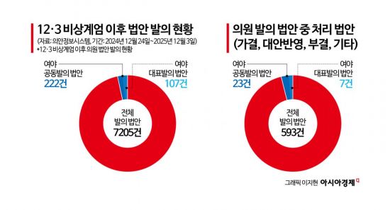 계엄 사태 이후 정국이 얼어붙으면서 공동 발의 등 협치의 폭도 좁아졌다는 분석이다. 조기 대선 이후 거대 여당이 된 더불어민주당은 의석수를 앞세워 개혁 입법을 몰아붙였다. 소수 야당으로 전락한 국민의힘은 정치 공세 외에는 힘을 쓰지 못했다. 국회 관계자는 "패스트트랙 제도가 도입되고 법안 발의 건수를 의원 평가에 반영하면서 굳이 공동발의를 고려하지 않는다"며 "계엄 이후로는 여야 의원들이 모이기만 해도 당성을 의심받는 분위기"라고 전했다.