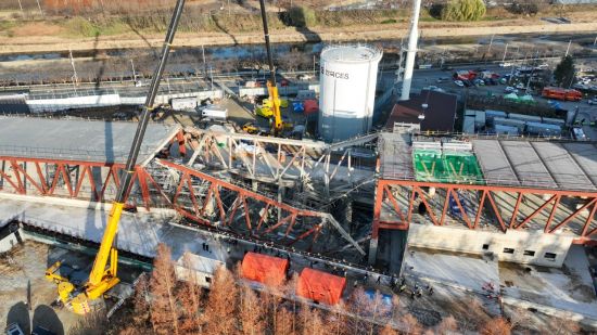 광주대표도서관 신축 현장 붕괴 사고 이틀째인 12일, 광주 서구 치평동 공사 현장에서 구조당국이 크레인을 투입해 매몰 지점 주변을 정리하며 수색 작업을 이어가고 있다. 광주소방 제공