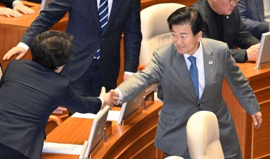 정동영 통일부 장관이 12일 서울 여의도 국회에서 열린 12월 임시국회 본회의에 출석해 형사소송법 개정법률안의 무제한 토론 중단의 건에 대한 투표를 한 뒤 여당 의원들과 인사하고 있다.