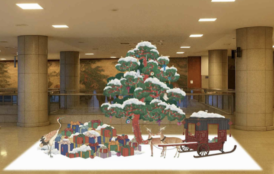 국립고궁박물관은 15일 2층 로비에서 소장 유물 십장생도를 활용한 크리스마스트리 장식을 공개했다. 붉은 줄기의 우람한 소나무에 눈을 얹고, 댕기·버선·복주머니·노리개 등 전통 소품을 장식했다. 트리 앞에는 코가 빨갛게 물든 사슴과 함께 썰매로 재해석한 임금의 가마 가교(駕轎)를 배치했다.