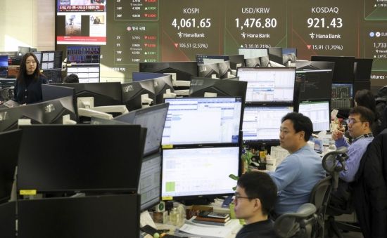 코스피 지수가 전 거래일 대비 113.42포인트 하락한 4053.74에 개장한 15일 서울 중구 하나은행 딜링룸 전광판에 국내 지수 현황이 표시돼 있다. 이날 원달러 환율은 전 거래일 대비 2.3원 오른 1476원에 거래를 시작했다.