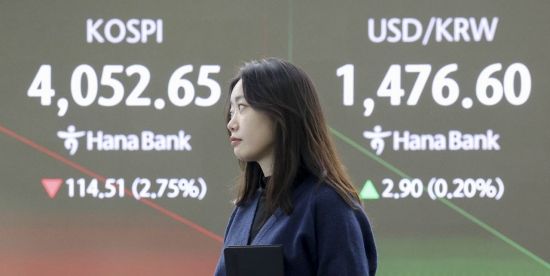 코스피 지수가 전 거래일 대비 113.42포인트 하락한 4053.74에 개장한 15일 서울 중구 하나은행 딜링룸 전광판에 국내 지수 현황이 표시돼 있다. 이날 원달러 환율은 전 거래일 대비 2.3원 오른 1476원에 거래를 시작했다.