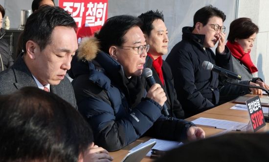 송언석 국민의힘 원내대표가 15일 국회 본청 앞 천막 농성장에서 열린 최고위원회의에서 발언하고 있다.