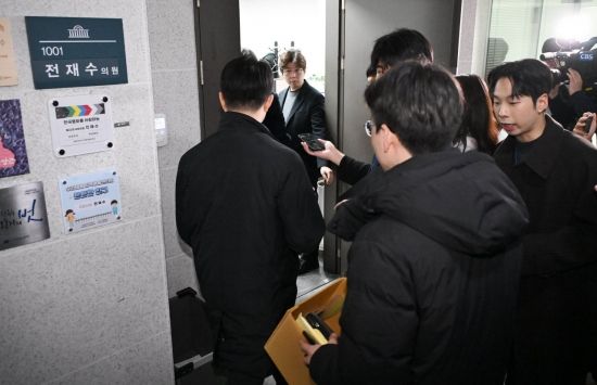경찰이 정치권 인사들의 통일교 금품 수수 의혹과 관련해 첫 강제수사에 착수한 15일 국회 의원회관 내 전재수 전 해양수산부 장관 사무실로 경찰 관계자들이 들어가고 있다.