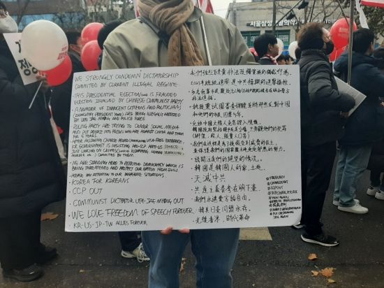 윤석열 전 대통령과 계엄에 대해 바라보는 시각은 달랐지만 공통으로 중국에 대한 반감이 강했다. 집회 현장에 있던 직장인 C씨는 "계엄이 불법인지 아닌지 판단하긴 어렵다고 본다"면서도 "그럼에도 한국의 근간인 자유민주주의가 중국으로부터 위협받고 있는데 그냥 눈뜨고 당할 수는 없다고 생각한다. 그런 점에서 계엄령이 계몽령일 수도 있다는 자유대학의 주장에 수긍해 나왔다"고 말했다.