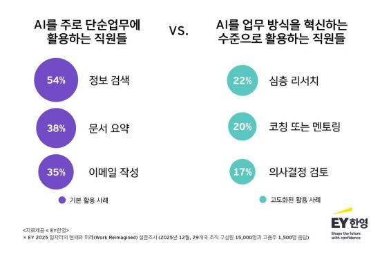 16일 글로벌 회계·컨설팅 법인 EY한영은 이같은 내용이 담긴 'EY 2025 일자리의 현재와 미래(EY Work Reimagined 2025) 설문조사' 결과를 발표했다. 이번 조사는 29개국 조직 구성원(직원) 1만5000명과 고용주(경영진) 1500명을 대상으로 AI 도입 수준, 인재 전략, 조직 문화 등을 분석했다.
