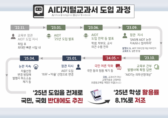 감사원에 따르면 교육부는 2023년 1월 AIDT의 2025년 도입 방침을 발표한 뒤, 외부 의견수렴 없이 7차례 내부회의만 거쳐 도입을 결정했다. 교육부는 같은 해 2월과 6월 기본계획을 발표하는 과정에서 간담회·협의회·토론회·워크숍 등을 22차례 열었지만, AIDT를 실제로 사용할 학생(학부모)과 교사로부터 도입 여부·도입 시기·의무도입 여부 등에 관한 의견을 수렴하지 않았다고 감사원은 지적했다.