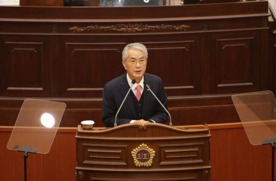 박종훈 경남교육감이 경남도의회 제428회 정례회 제6차 본회의에서 미래교육지구 예산 전액 삭감이 포함된 2026년도 경남도교육비 특별회계 예산안 통과 직후 입장을 밝히고 있다. 이세령 기자