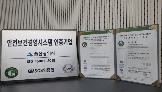 울산시는 국제표준화기구(ISO)로부터 '안전보건경영시스템(ISO 45001)' 국제인증을 취득했다.