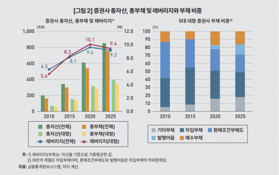 이 문제의식은 현행 증권사 자본건전성 판단 지표인 순자본비율(NCR) 제도가 증권사 외형 성장에 수반되는 위험을 충분히 반영하지 못한다는 데서 시작했다. 대형 증권사를 중심으로 자산과 레버리지가 빠르게 확대되며 파생상품 투자·RP·발행어음을 통한 단기 자금 조달이 증가하고 있다. 전체 증권사의 평균 레버리지 비율은 2010년 6.3배에서 2025년 9.2배로 증가했으며, 대형 증권사는 같은 기간 5.6배에서 9.4배로 상대적으로 더 큰 폭의 상승을 기록했다.