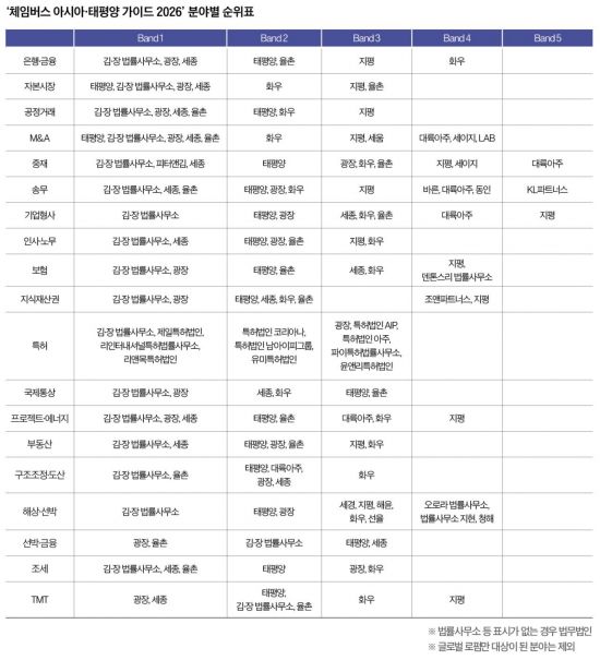 세계적인 법률 평가 매체 '체임버스앤파트너스(Chambers and Partners)'가 발표한 '체임버스 아시아·태평양 가이드 2026 (이하 가이드)'에서 김·장 법률사무소가 19개 평가 분야 중 17개에서 최고 등급인 'Band 1'에 선정됐다. 법무법인 세종과 법무법인 율촌의 상승세도 두드러졌다. 국제중재와 해운 등 일부 평가 분야에서는 부티크 로펌의 약진도 눈에 띄었다.