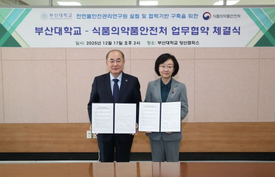 부산대학교(총장 최재원)와 식품의약품안전처(처장 오유경)는 지난 17일 오후 부산대 양산캠퍼스에서 천연물 분야 지·산·학·연·병 공동연구와 인력·학술 교류 강화를 위한 업무협약을 체결하고, 캠퍼스 내 첨단산학단지에서 천연물안전관리연구원 개소식을 개최했다.