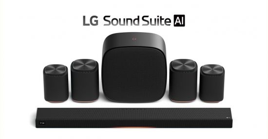 LG 사운드 스위트(LG Sound Suite)의 사운드바(사진 하단)와 무선 서라운드 스피커(사진 왼쪽에서 첫 번째·두 번째 및 오른쪽에서 첫 번째·두 번째), 서브우퍼(사진 중앙) 구성. LG전자.