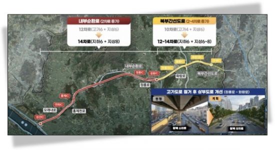 대신 지하에 왕복 6차로의 지하도로를 건설한다. 철거된 상층부 고가 자리에 1~2개 차선이 추가로 생겨나는 점을 감안하면 내부순환로는 현재 12차로(고가 6차로+지상 6차로)에서 14차로(지하 6차로+지상 8차로), 북부간선도로는 현재 10차로(고가 4차로+지상 6차로)에서 최대 14차로(지하 6차로+지상 8차로)로 확대된다.