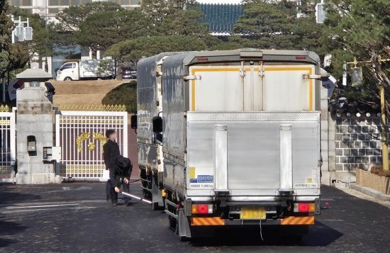 용산 대통령실의 청와대 복귀가 가까워지면서 검문검색이 한층 강화된 가운데 18일 오후 이삿짐을 실은 대형 차량들이 청와대본관 진입을 위해 검색을 받고 있다.