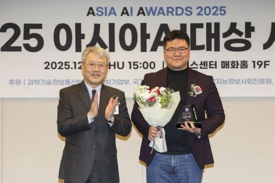 원재호 앵커노드 대표(오른쪽)가 18일 서울 중구 한국프레스센터에서 열린 '2025 아시아AI대상' 시상식에서 AI비즈니스모델상(아시아경제 대표상)을 수상하고 있다. 2025.12.18 강진형 기자