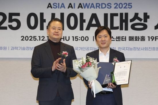 고석태 제논 대표(오른쪽)가 18일 서울 중구 프레스센터 매화홀에서 열린 '제3회 아시아AI대상 시상식'에서 벤처기업협회장상을 수상하고 기념 촬영을 하고 있다. 2025.12.18 강진형 기자
