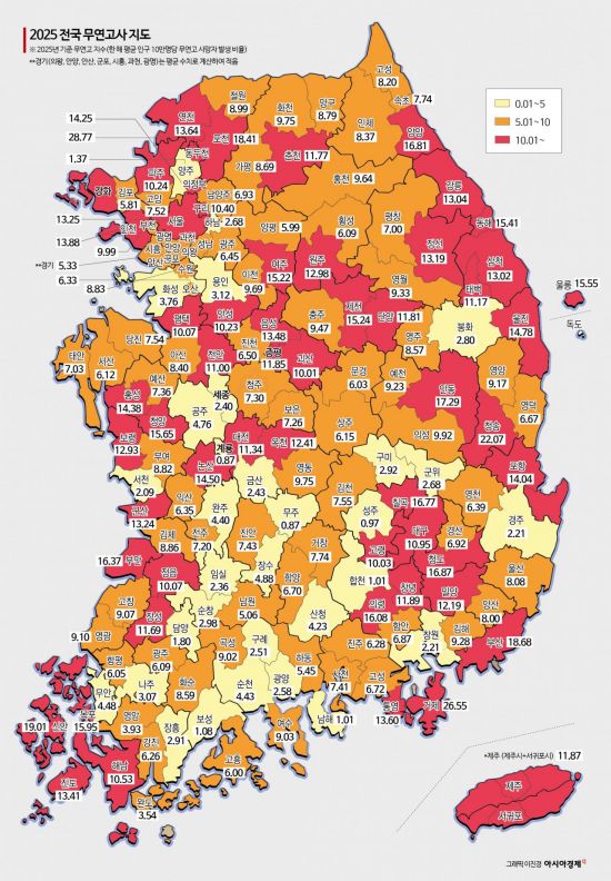 무연고 지수는 10만명당 무연고 사망자 수를 계산한 수치다. 이렇게 산출된 무연고 지수가 10을 초과하는 지역을 고위험군, 10보다 작거나 같으면서 5를 초과하는 지역을 위험군으로 분류했다. 한국 전체가 이미 무연고사 고위험군에 들어간 셈이다. 아시아경제는 2021년에도 절대적인 무연고 사망자 수만을 바탕으로 해당 지역의 실태를 파악하는 것보다 객관적인 평가를 위해 이 같은 수치를 산출한 바 있다.