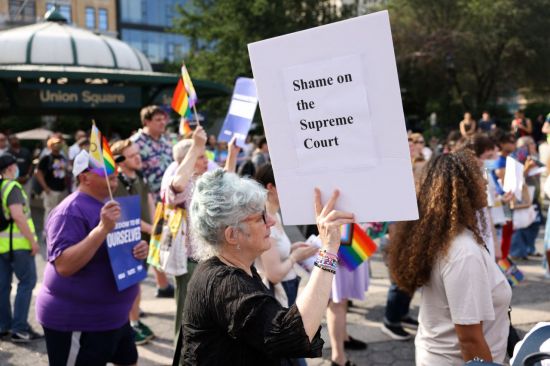 지난 6월18일(현지시간) 미국 대법원이 트랜스젠더 청소년에 대한 일부 의료 서비스를 금지하는 테네시 주법을 합헌으로 판결한 후, 뉴욕 유니언 스퀘어에 성난 시민들이 모였다. 로이터연합뉴스